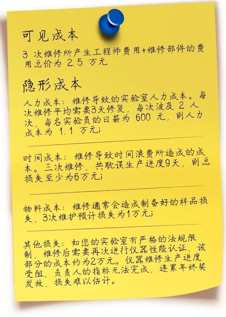 您一定遇到過這些情況:儀器突然損壞;儀器接連損壞;損壞后維修周期過長,耽誤工作進程,年終任務沒完成,年終獎拜拜了。這些都是隱形成本。隱形成本更可怕!隱形成本更可怕!隱形成本更可怕!(重要的事情說三遍!)